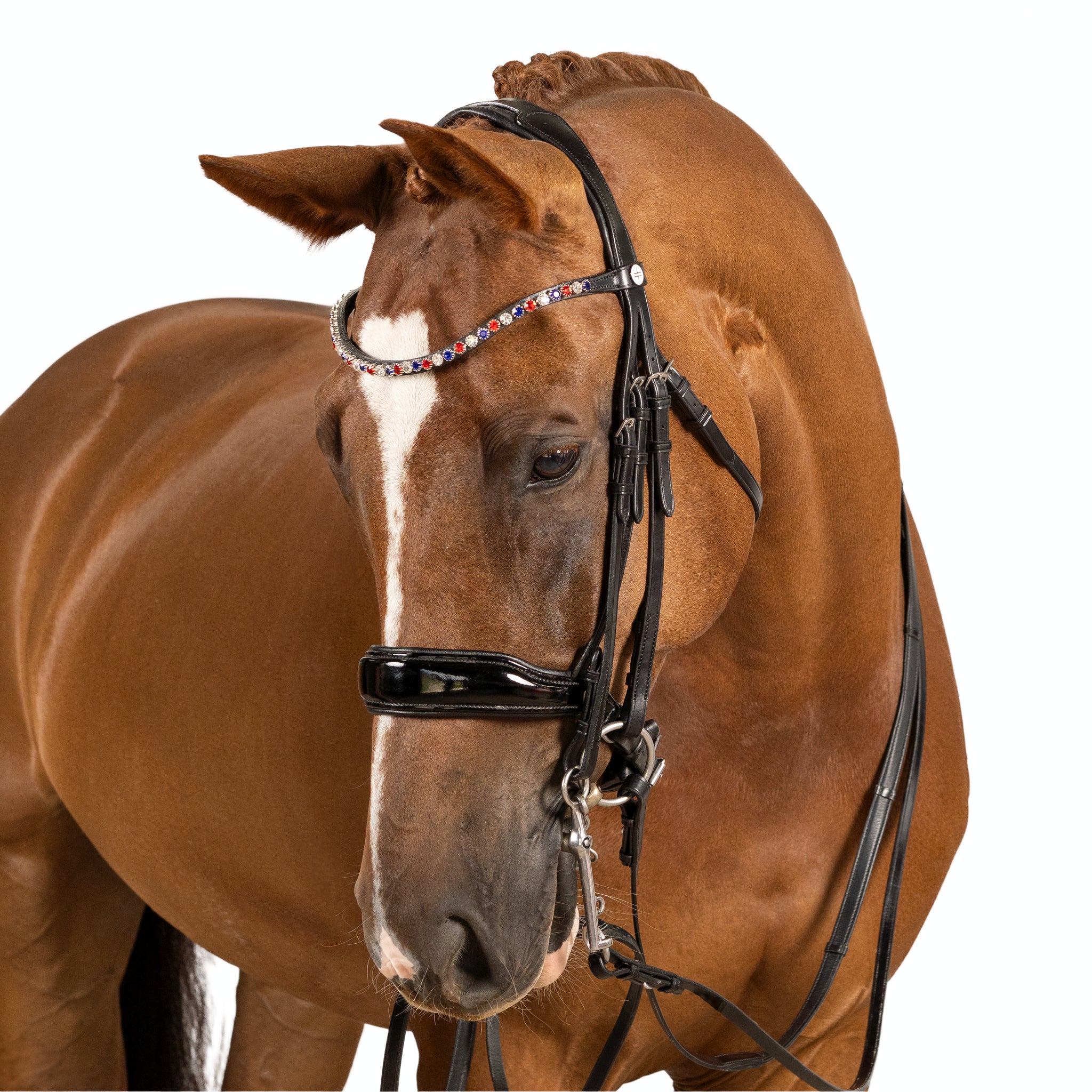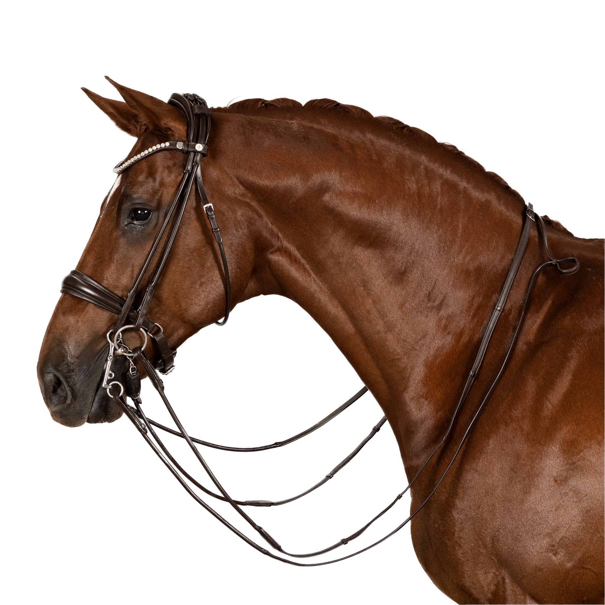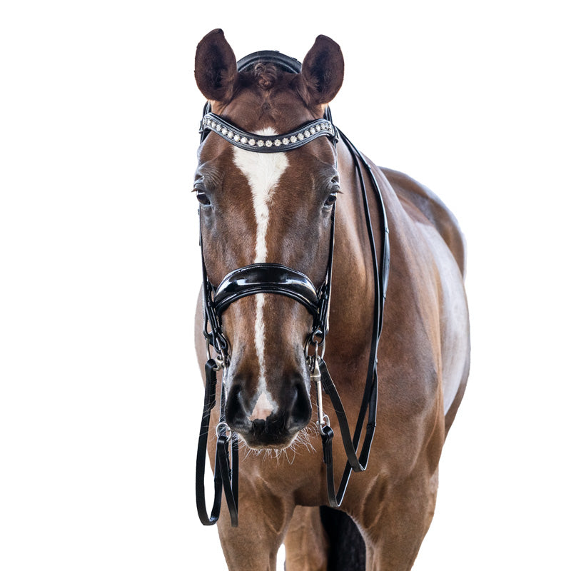 Brow band and Cheek piece Adjustments: Ensure that the brow band is wide enough to fit comfortably behind the horse's ears without pressing on them. It should provide sufficient space for the bridle and bits to rest without causing discomfort. Adjust the cheek pieces so that the bridle sits snugly, yet comfortably, on the horse's head without exerting excessive pressure on the sensitive facial structures.