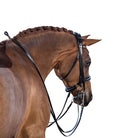 The Glam style patent leather noseband features rounded dee rings and a slim line crank pad. The streamlined noseband ensures the cheek pieces maintain close contact with the face at they connect to the bit. The noseband on the double bridle is attached to the crown piece with a billet so there are no buckles in contact with the horses face.