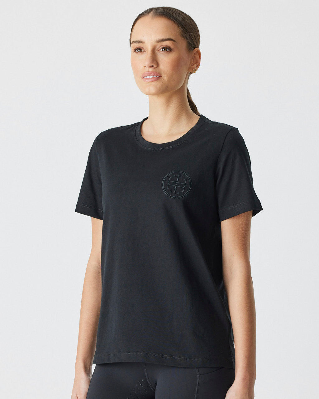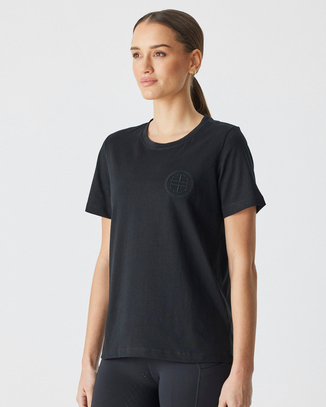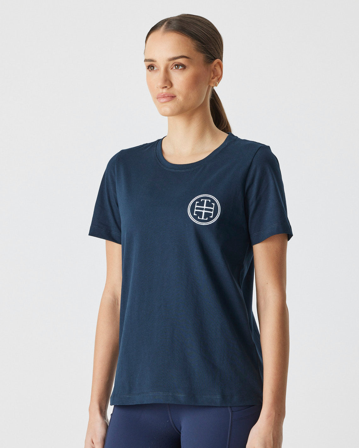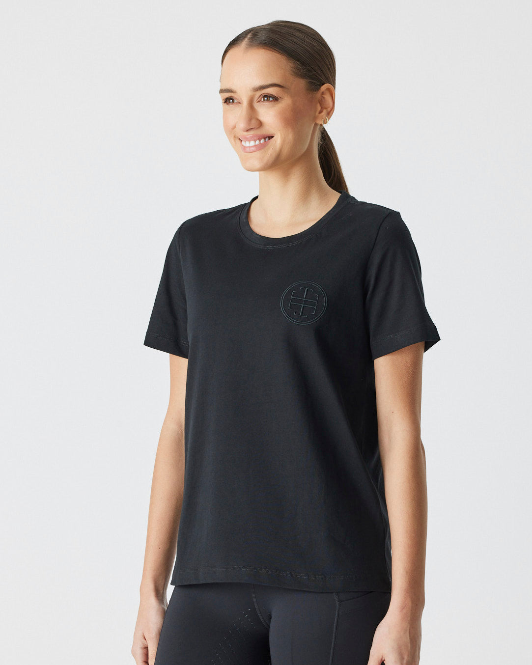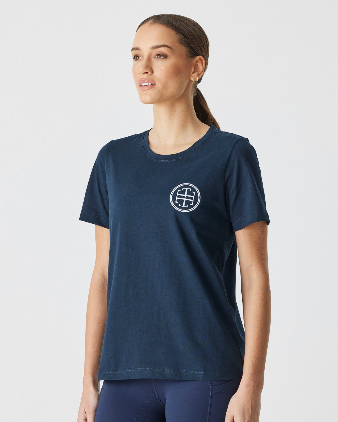 An up-for-anything relaxed fit tee featuring a crisp white embroidered logo. This cotton tee hangs so nicely you can easily wear this out and about after jumping off your horse.