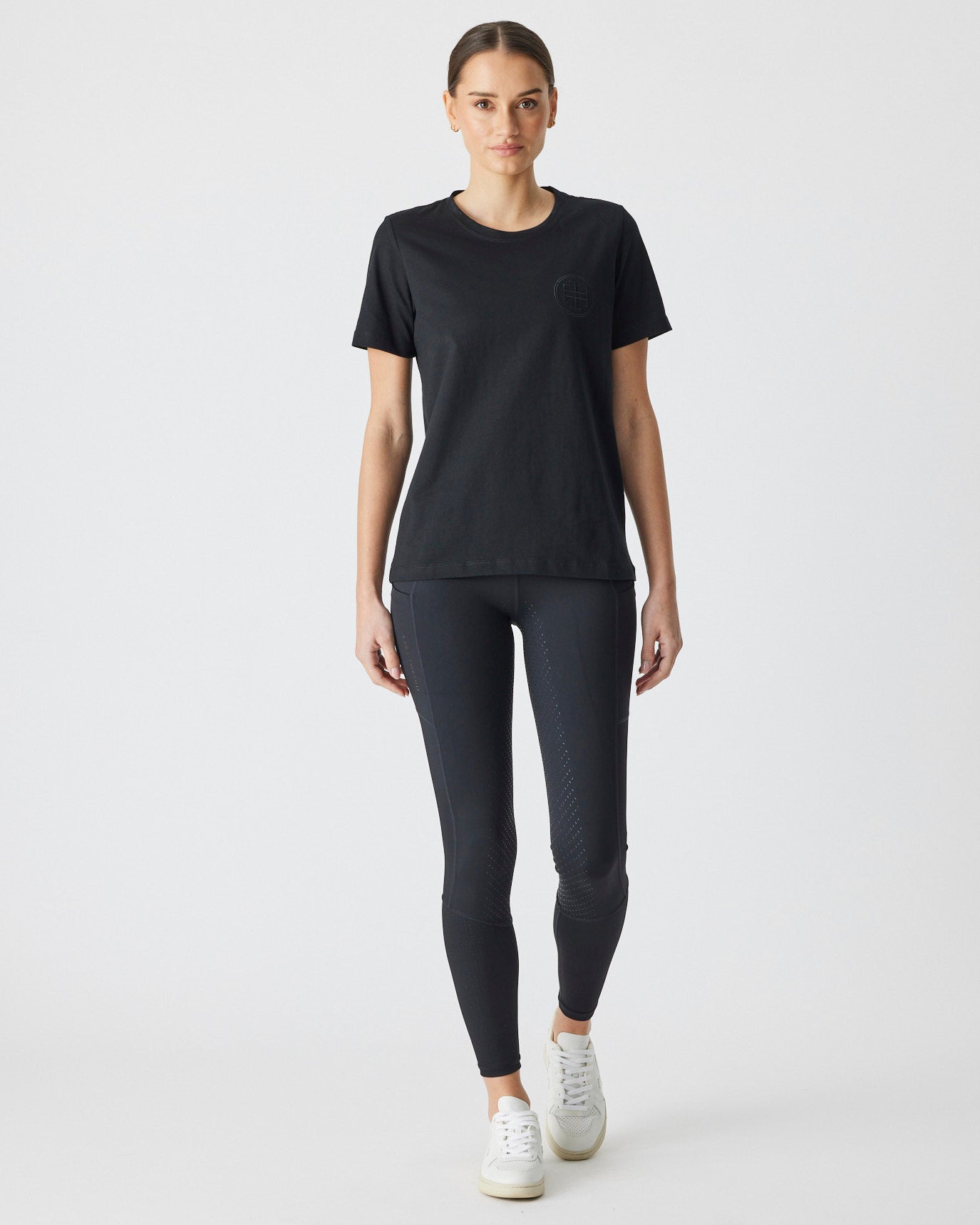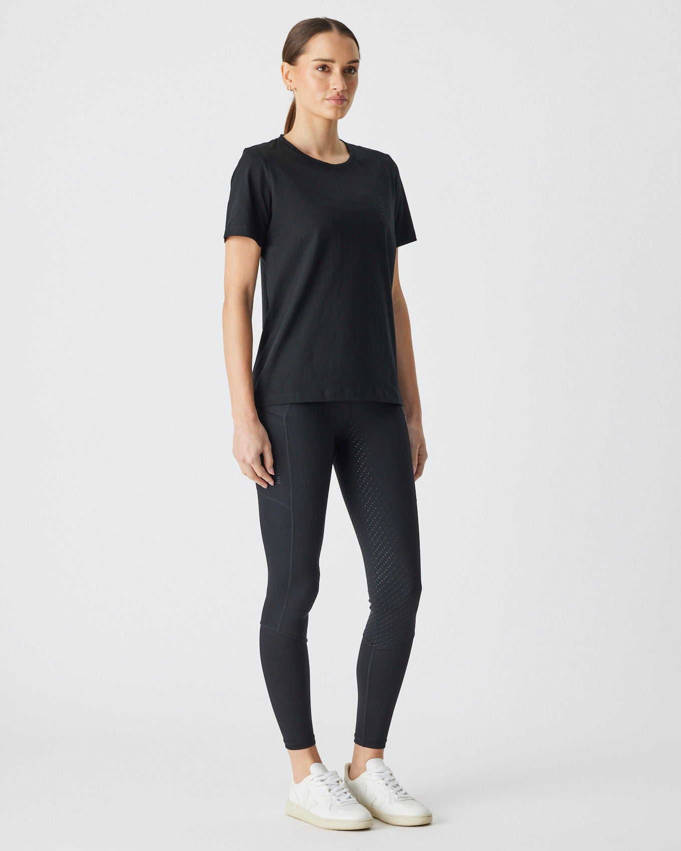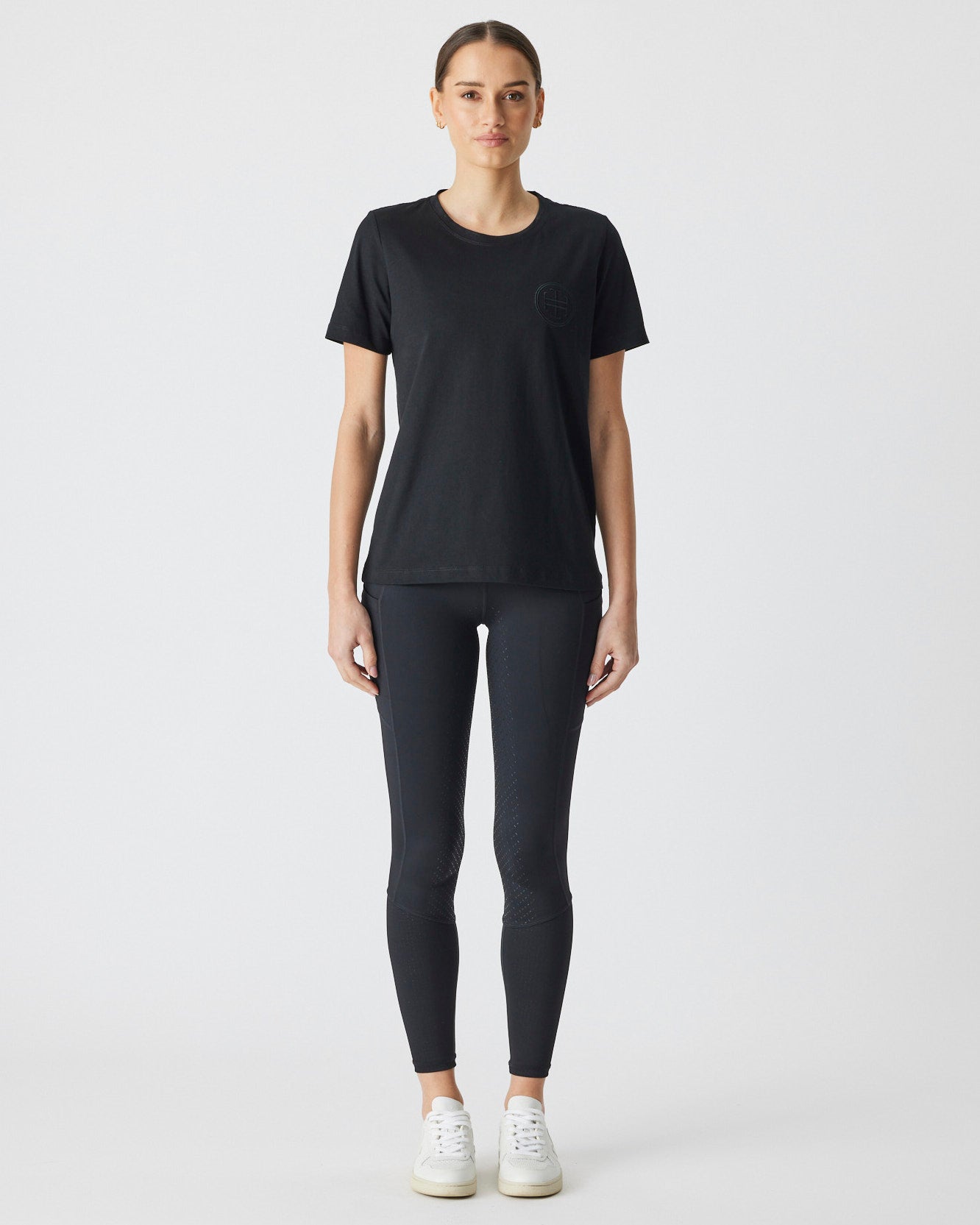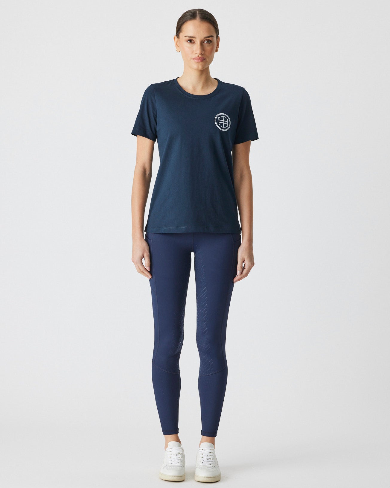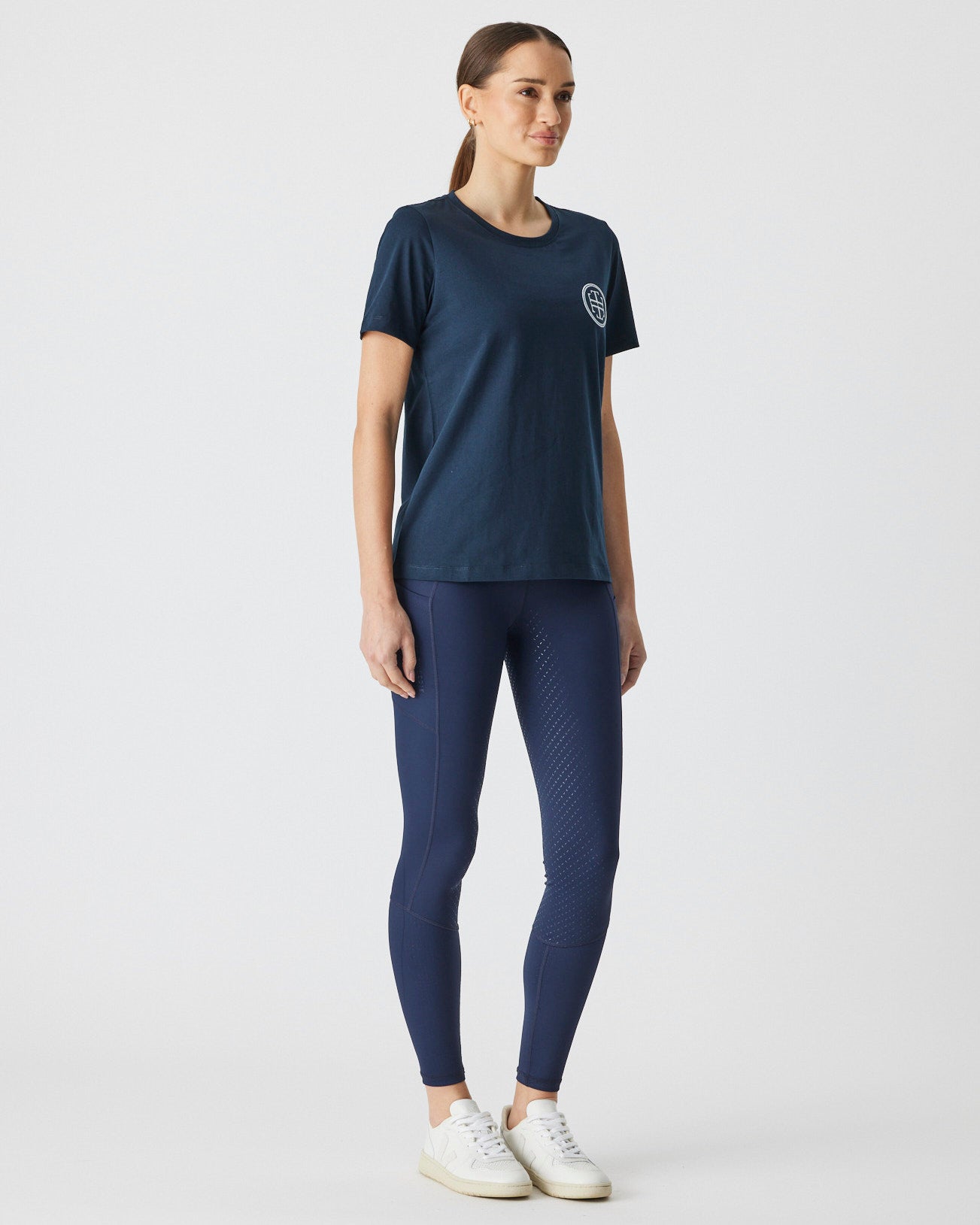 An up-for-anything relaxed fit tee featuring a crisp white embroidered logo. This cotton tee hangs so nicely you can easily wear this out and about after jumping off your horse.