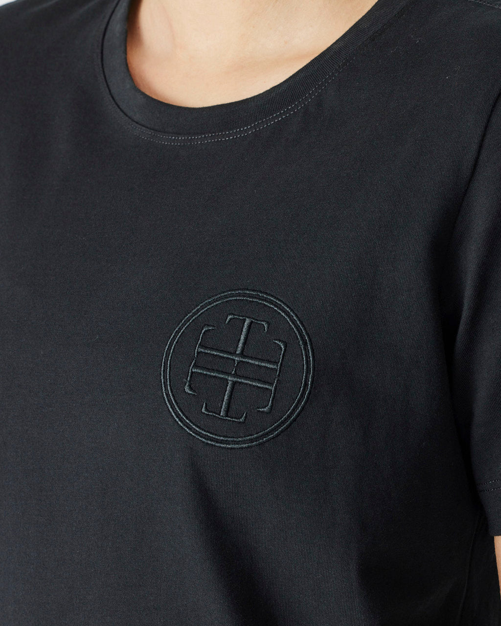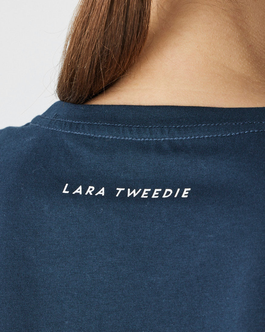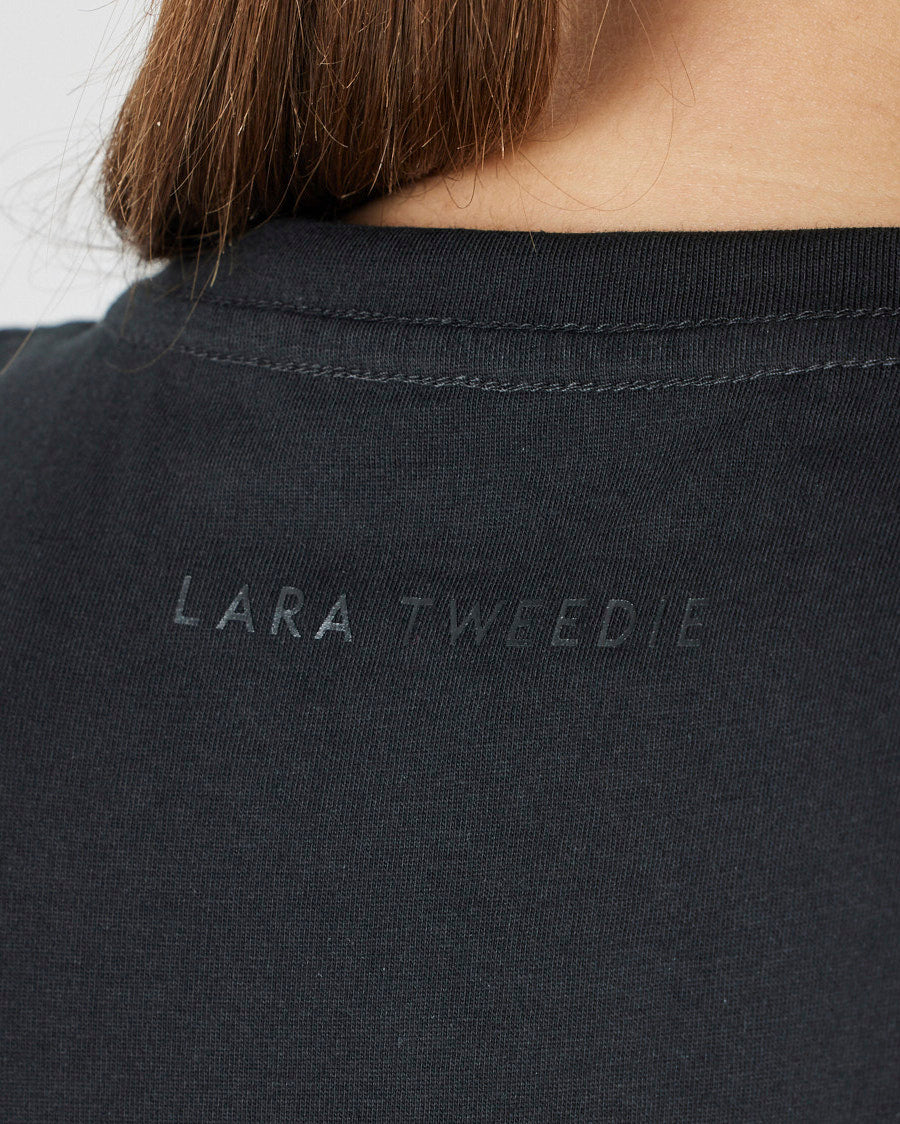 Details: Black embroidery logo on black t-shirt. Lara Tweedie logo transfer on back neck.