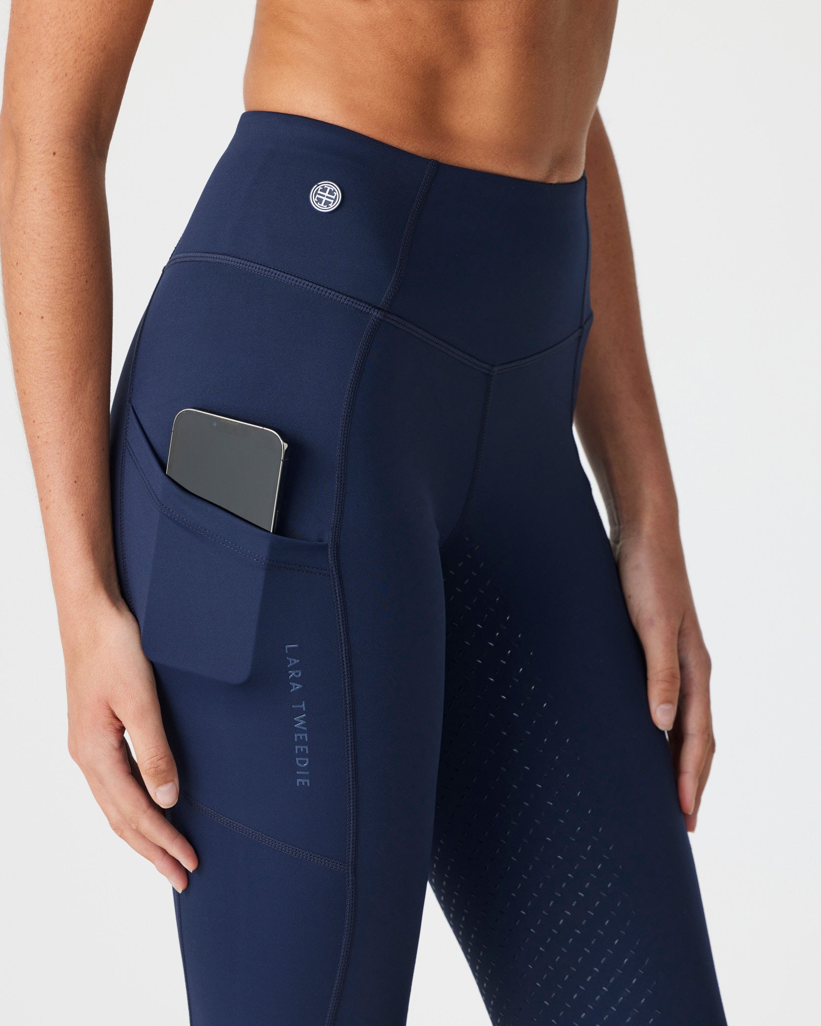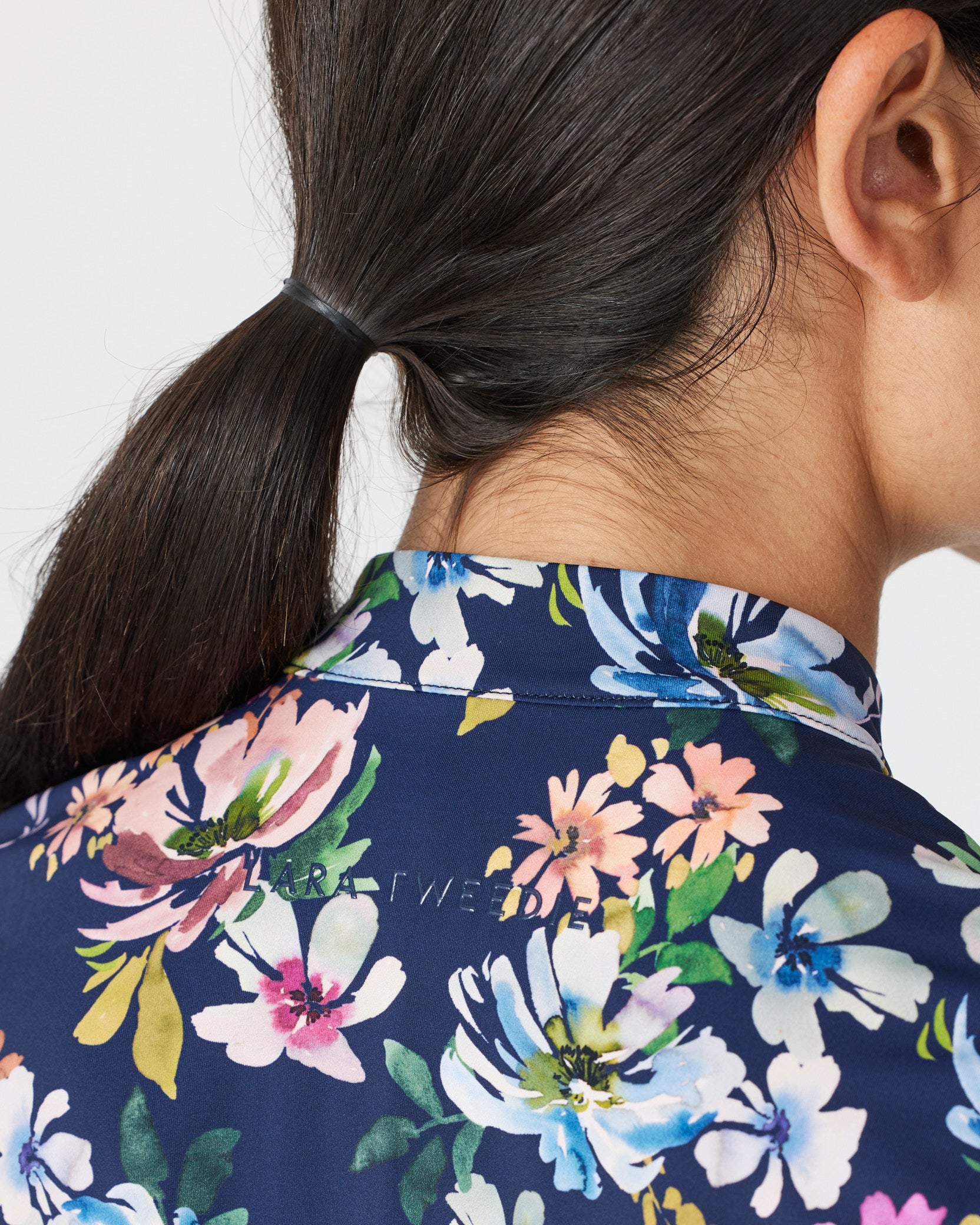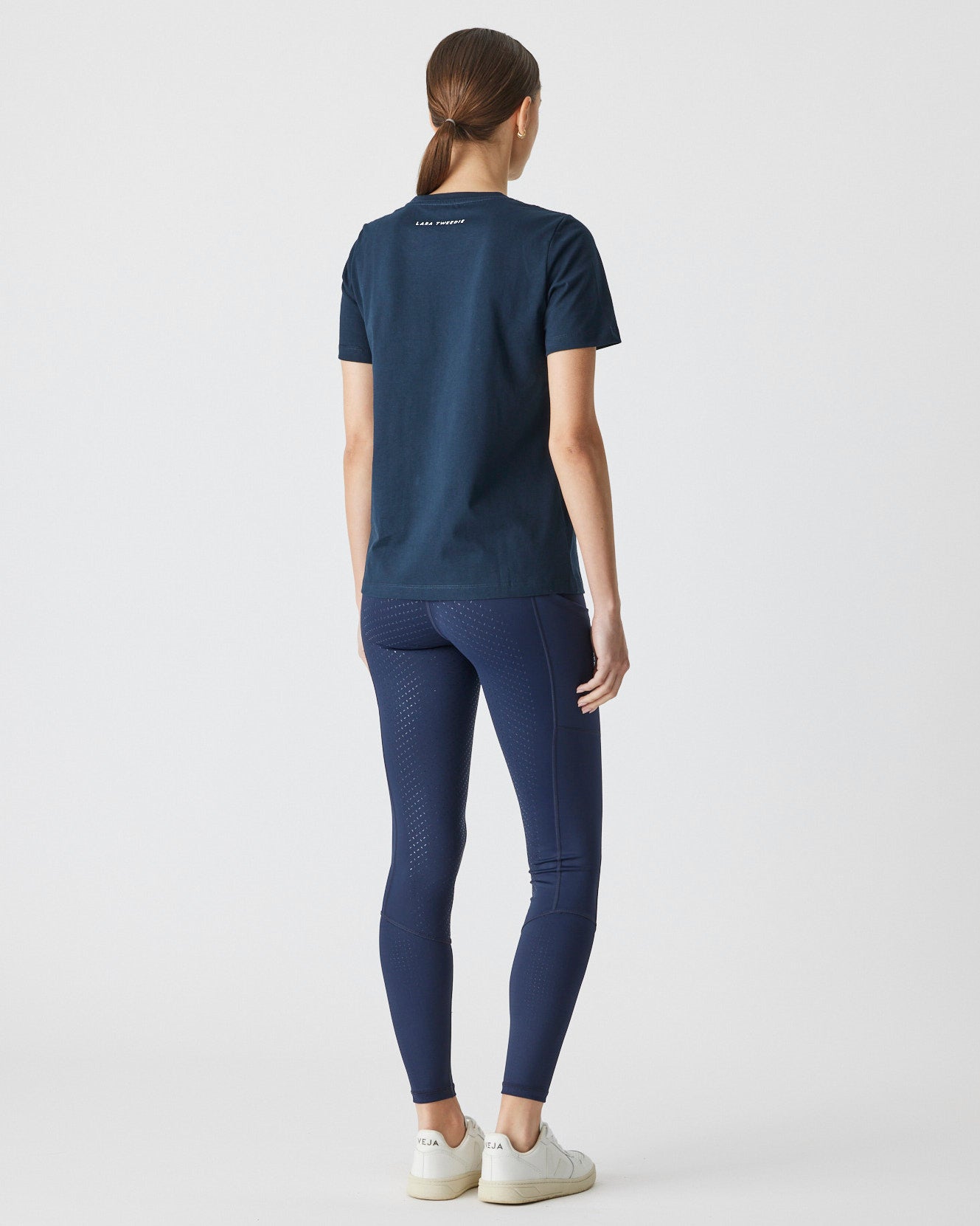 Details: Black embroidery logo on black t-shirt. Lara Tweedie logo transfer on back neck.
