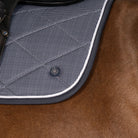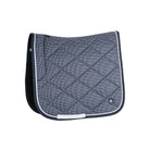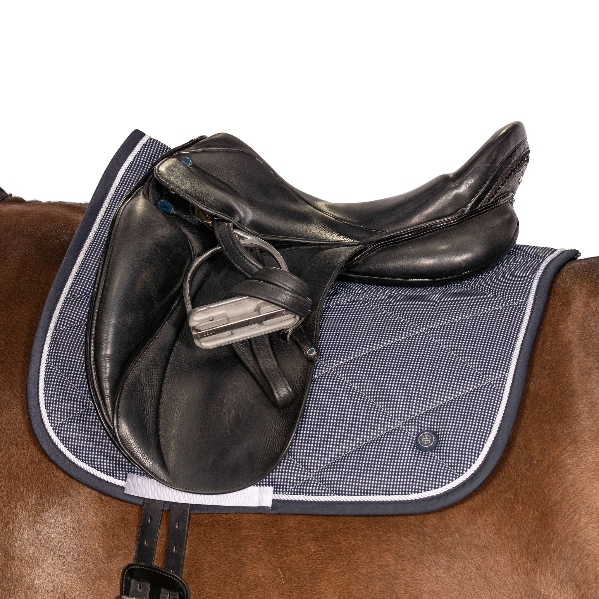 This ultra soft dressage saddle pad is the ultimate in comfort for your horse. Super soft cotton waffle weave lining and eco fill offer natural breathability. The Navy Mini Check print is accented by a complimentary diamond quilt.