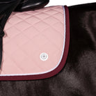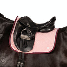 This ultra soft dressage saddle pad is the ultimate in comfort for your horse. Cotton waffle weave lining and eco fill offer natural breathability. This classic style, pink jersey saddle pad is accented by a complimentary diamond quilt.