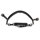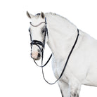 The wide, patent leather noseband is cut away below the facial crest and slims as it traverses the body of the mandible. The noseband features rounded dee rings and a our ultra soft crank pad. The streamlined noseband ensures the cheek pieces maintain close contact with the horse as they connect to with the bit.